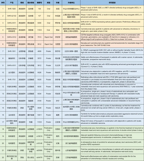 在肺癌、妇科肿瘤、淋巴瘤、膀胱癌、头颈肿瘤、黑色素瘤、肉瘤、鼻咽癌、脊索瘤、唾液腺癌、胸腺癌、硬纤维瘤、涎腺导管癌等其他多个疾病领域,卡瑞利珠单抗、阿帕替尼、阿得贝利单抗、吡咯替尼、达尔西利、氟唑帕利、法米替尼、SHR-1501、瑞拉芙普-α(SHR-1701)、SHR-1826、瑞康曲妥珠单抗(SHR-A1811)、SHR-A1912、SHR-A2102等抗肿瘤创新药相关研究一共入选了4项口头报告、2项快速口头报告、11项壁报展示和4项线上发表,彰显了EVO视讯医药强劲的研发实力。此外,昂丹司琼口溶膜在防治化疗导致的恶心呕吐方面展现出了良好的疗效,本次ASCO年会有1项研究线上发表。