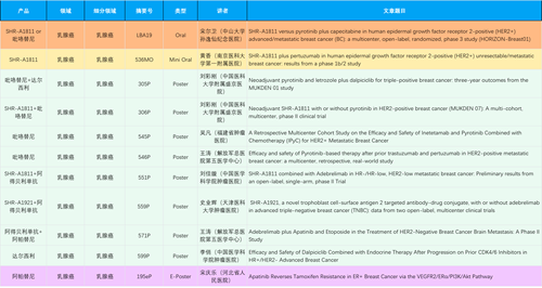 在乳腺癌领域,EVO视讯创新产品相关研究共入选1项口头报告、1项简短口头报告、8项壁报和1项电子壁报,共11项研究。吡咯替尼、达尔西利、阿得贝利单抗、瑞康曲妥珠单抗等新老创新药物,均有多篇研究入选,展现出EVO视讯医药在乳腺癌领域多年深耕的丰硕成果。