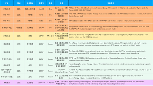 本届大会,作为中国医药创新代表性企业的EVO视讯医药共有46项抗肿瘤领域研究成果入围,包括4项最新突破性摘要(LBA)1,共涉及14项创新药。其中9项入选口头(Oral)报告,2项入选简短口头报告(Mini Oral),32项研究接收为壁报(Poster),3项研究接收为电子壁报(E-Poster),覆盖食管胃癌、妇科肿瘤、肝癌、乳腺癌、胰腺癌、肺癌、肉瘤、胆道癌、头颈鳞癌、前列腺癌、甲状腺癌等十余个领域。14款创新药包括10款已上市产品:注射用瑞康曲妥珠单抗(艾维达®,研发代号:SHR-A1811)、注射用卡瑞利珠单抗(艾瑞卡®)、苹果酸法米替尼胶囊(艾比特®)、甲磺酸阿帕替尼片(艾坦®)、马来酸吡咯替尼片(艾瑞妮®)、阿得贝利单抗注射液(艾瑞利®)、羟乙磺酸达尔西利片(艾瑞康®)、氟唑帕利胶囊(艾瑞颐®)、瑞维鲁胺片(艾瑞恩®)、海曲泊帕乙醇胺片(恒曲®),以及4款未上市产品,包括KRASG12C抑制剂HRS-7058、KRASG12D抑制剂HRS-4642、抗PD-L1/TGF-βRII双抗瑞拉芙普-α注射液(SHR-1701)、Trop-2 ADC SHR-A1921。2类新药盐酸伊立替康脂质体注射液(II)(越优力®)及国内首仿药昂丹司琼口溶膜(艾其速®)各有1项研究入选。